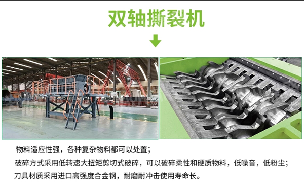 設備(bèi)配置:板式喂料機、階梯(tī)棒條篩、雙(shuāng)軸撕裂機、滾筒篩、臥式打散風選(xuǎn)機、人工分揀倉(cāng)、除鐵器、收塵器等(děng)
