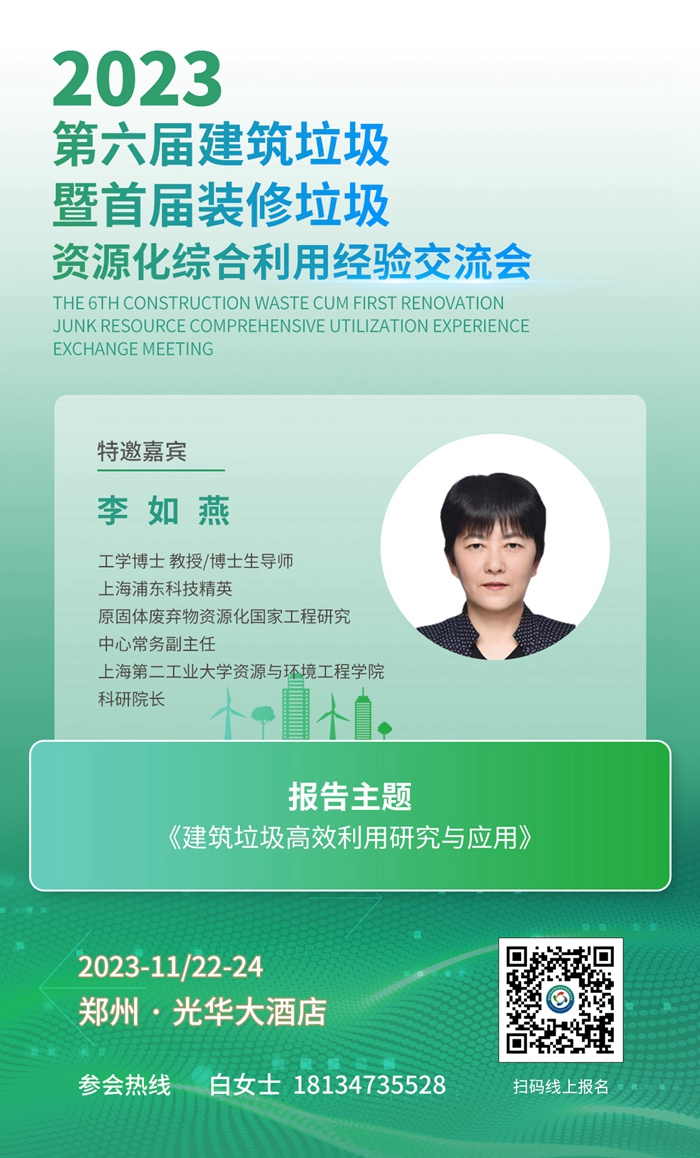 由中華環(huán)保聯合會、鄭州精东影业传媒企(qǐ)業集團聯合主辦的(de)“第六屆建築垃圾資源化綜(zōng)合(hé)利用經驗交流會”將於(yú)2023年11月22日一24日在鄭州(zhōu)光華大酒店召開,同時舉辦“首屆裝修裝潢(huáng)垃圾資源化綜合利用經驗交流會”。上海第二工業大學資源與環(huán)境工程(chéng)學院科研(yán)院長李如燕女(nǚ)士將蒞臨本(běn)次大會並作主題報告!