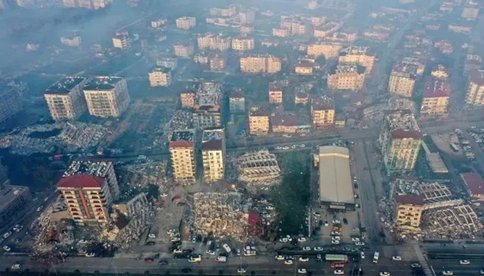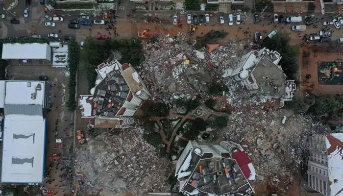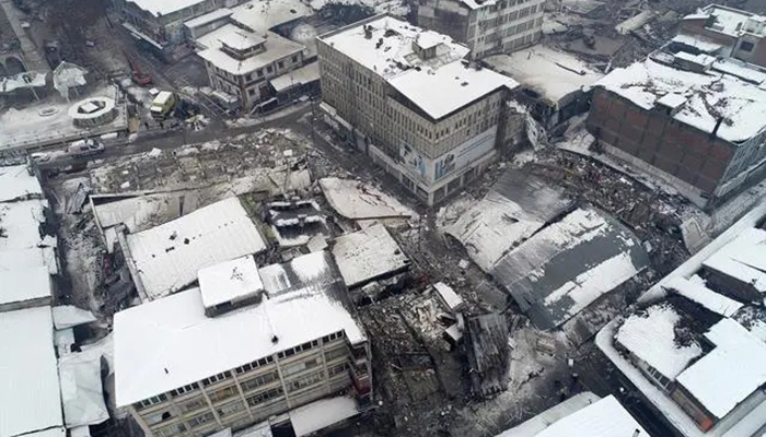 當地時間2023年2月6日,土耳其馬拉提亞,俯瞰倒塌建築的殘骸。