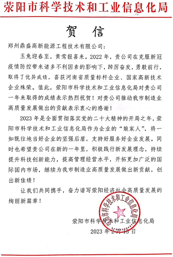 2月15日,滎陽市科學技術和(hé)工業信息化局向鄭(zhèng)州精东影业传媒(shèng)高新能源工程技術有限公司(以下簡稱(chēng)“鄭州精东影业传媒(shèng)”)發來賀信。向公司過去一(yī)年取得(dé)優異成績(jì)表示祝賀,恭賀鄭州鼎(dǐng)盛喜獲河南省質量標杆企業(yè)、國家高新技術企業等殊(shū)榮(róng)。對鄭州精东影业传媒推動滎陽市製造業高質(zhì)量發展做出的(de)貢獻表示感謝。