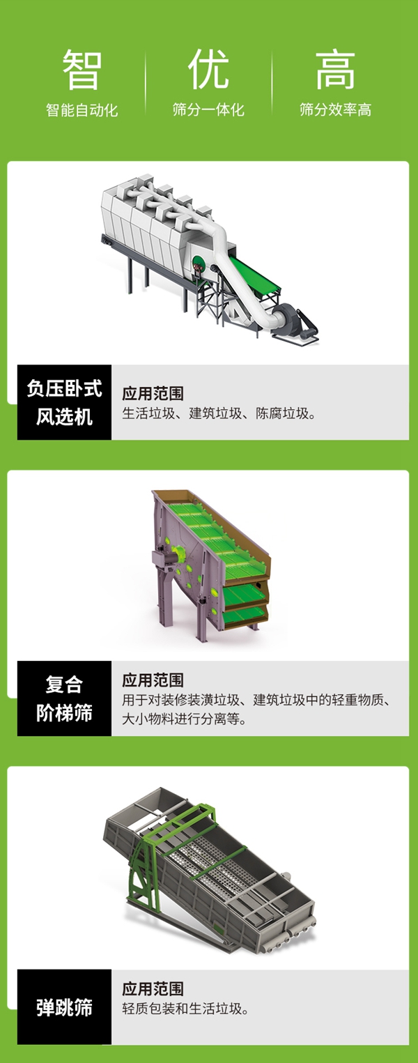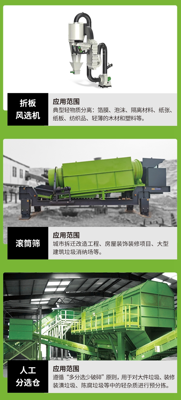 無(wú)論是裝潢(huáng)垃圾裏的混凝土塊還是(shì)其(qí)他裝潢廢料,均能被有效篩分,並對鋼筋等黑色金屬、銅(tóng)等有色金屬、木頭、薄膜等(děng)裝潢(huáng)垃圾進行歸類,回收加以利用,創造(zào)再生價值。