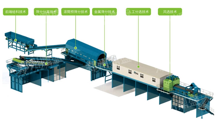 裝修裝(zhuāng)潢垃圾等混合物料通(tōng)過抓鬥等裝載機械,運(yùn)行至生產線(xiàn)的原料儲備倉(cāng),通(tōng)過振動給料機均(jun1)勻(yún)給(gěi)料,隨後,經過(guò)輸送機輸送至棒條階梯(tī)篩中,將物料分為大於(yú)150mm和小於150mm兩種物料,其中,得到大於150mm的物料通過皮帶機輸送至(zhì)人工分揀平台進行分揀,分揀出塑料、木材等,隨後這些大於150mm的(de)潔淨重骨料進入建築垃圾破碎(suì)生產線中,進行破碎生產得到合格的成(chéng)品骨料,小於150mm的物料經皮帶機輸(shū)送至滾筒篩中,分離成小於25mm的物(wù)料和25mm-150mm的物料,其中25-150mm的(de)物料進入到新型臥式(shì)風選機中進行風選(xuǎn),分離出輕(qīng)物質,從風選機中剝離出輕雜質(zhì)的物料進入人工分揀平台,進行分類(lèi)分揀,獲得25-150mm潔淨重骨料,這些重骨料(liào)將運(yùn)輸到建築垃(lā)圾破碎生產線中,進行破碎生產得到合格成品骨料,小於25mm的物(wù)料進入到細碎機中進行破碎,得到10mm以下的(de)物(wù)料,作為渣土成品,而分離出的輕物質通過打包機打包,將整齊(qí)碼放在輕物質成品區,客戶可根據市(shì)場情況進行銷售或(huò)其他處理,經過處理後得到混合可(kě)燃物,廢金屬、再(zài)生骨(gǔ)料、木材、紙板、混合渣土等,讓項目經濟效益進一步提升。
