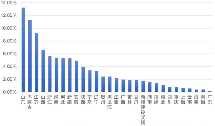 碳排放配額是國家分配給重(chóng)點排放單位(wèi)的規(guī)定時期內的碳排放額(é)度生態(tài)環境部根據國家溫室氣體(tǐ)排放控製要求,製定(dìng)碳排放配額總量確定與分配(pèi)方案,2020年12月,生態環(huán)境部印發《2019-2020年全國(guó)碳排(pái)放權交易配額總量設(shè)定與(yǔ)分配實施方案(發(fā)電行業)》。第一個履約周期采用基於碳排放強(qiáng)度控製目標的行業基準(zhǔn)法,核算重點排放單位擁有各類機組的(de)配(pèi)額數量,加總確定全國配額總量,通過預分配(pèi)和核(hé)定分配兩個(gè)階段全部免費發放。全國碳市場第一個履約周期配額分配量最大的地區是山東、內蒙古、江蘇,配額總量占全國33.71%(如圖4所示)。300MW等級以上常規燃煤機組、300MW等級及以(yǐ)下常規燃煤機組、非常規燃煤機組、燃氣機組分配配額(é)量分別占總配額量的32.4%、48.3%、18.4%、0.9%。