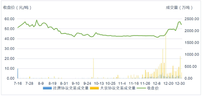 全國碳市(shì)場第一個履約周期納入的重點排放(fàng)單位為發電(diàn)行業(yè)(含其他行業自備電廠)2013-2019年任一年排放達到2.6萬噸二氧化碳當量(綜合能源消費(fèi)量約1萬噸標準煤)及以上的企業或者其他經濟組織,共2162家(jiā)重點排放單位,年度覆蓋二氧化碳排(pái)放量約(yuē)45億噸,是全球覆蓋排放量規模最大的碳市場。截至2021年12月(yuè)31日,第(dì)一(yī)個履約周期(qī)共運行114個交易日,碳排(pái)放配額累(lèi)計成交量(liàng)1.79億噸,累計成交金額76.61億元,成交均價42.85元/噸,每日收盤(pán)價(jià)在40~60元/噸之間波動,價格總體穩中有升(如圖1所示)。