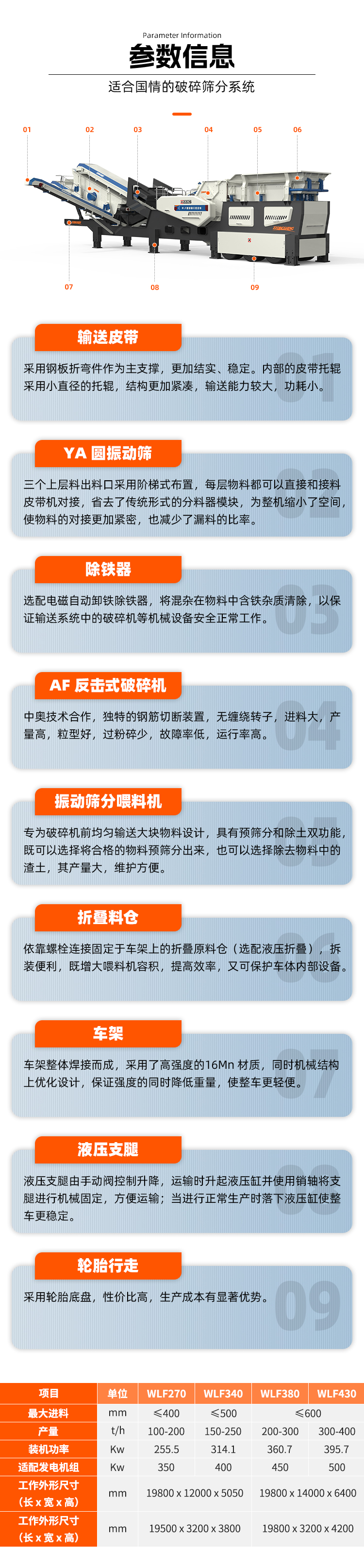 設備配置:WLF輪胎式破碎篩分聯合一體(tǐ)車