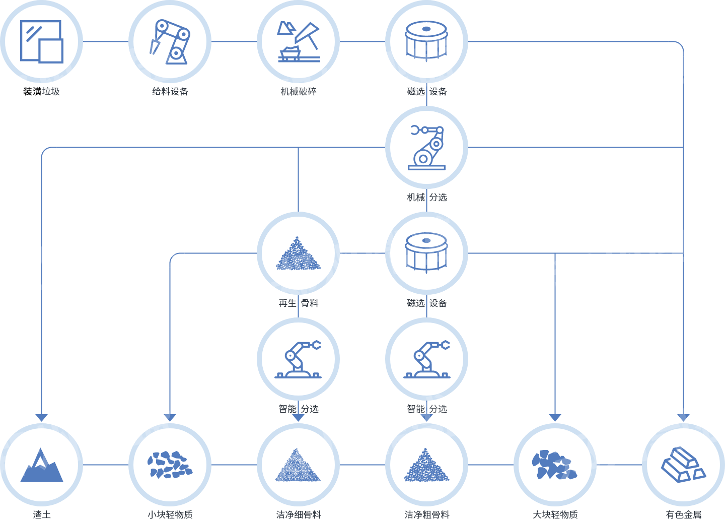 裝修(xiū)垃圾是建築(zhù)垃圾中成分較為複雜的一種,因此我(wǒ)們采用先分選後破碎,重分選而輕破碎的工藝理念(niàn),避免將雜物隨物料過度破碎反而增加分選難度。通過雙軸剪切式破碎機與反擊式破碎機的兩級破碎處理,同時經過振(zhèn)動篩分、人工/機械分(fèn)揀、風選、磁選、浮選等精細化處理,使砂石料與金(jīn)屬、輕物質充分分離,實現資(zī)源回(huí)收利用。